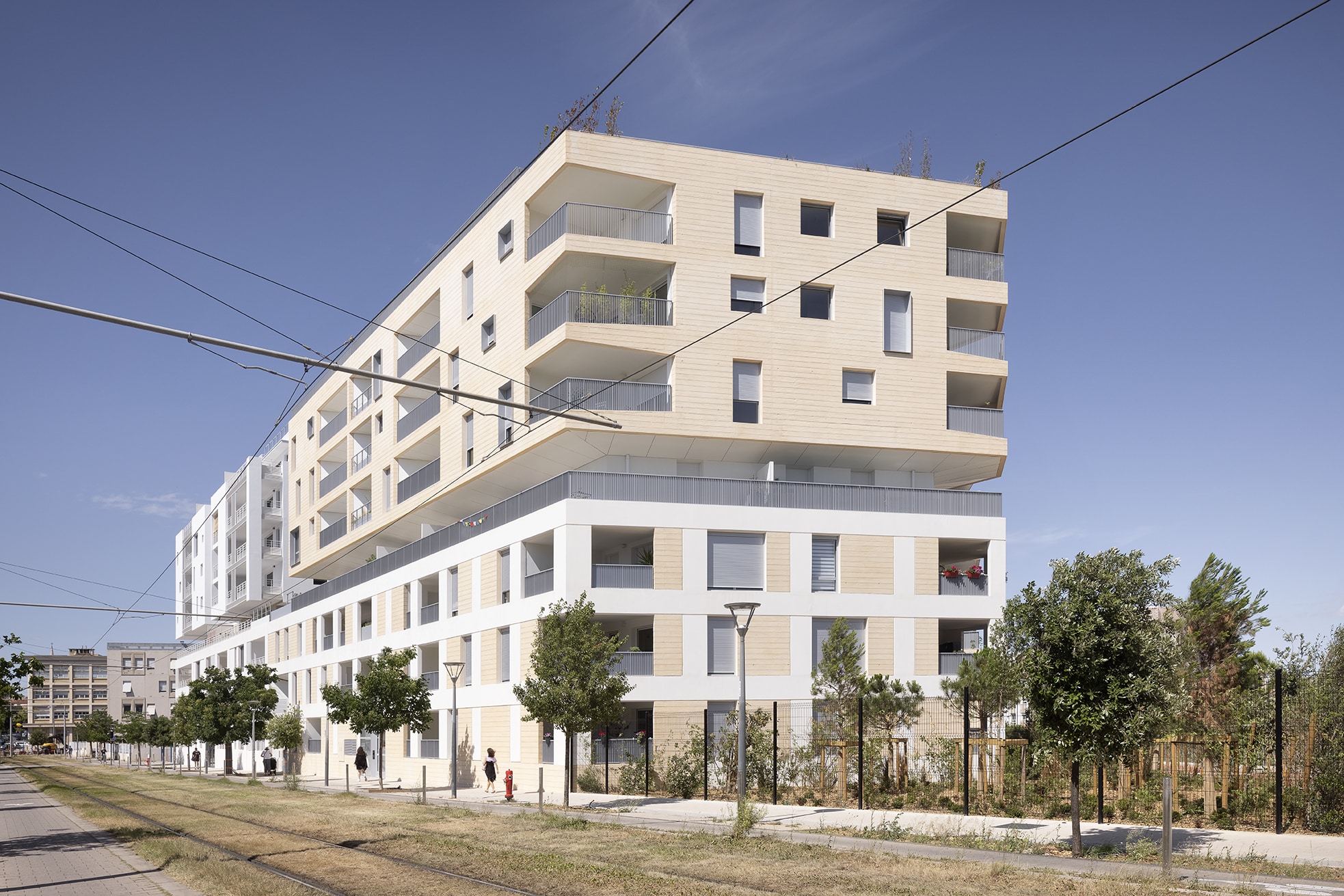 Le Lot VII de la ZAC Nouveau Saint-Roch surprend par sa forme triangulaire. Au-dessus de la taille de guêpe rappelant la morphologie du faubourg Rondelet, Carré Vendôme révèle sa personnalité : un volume monolithique en béton matricé teinté beige et des extrusions de terrasses à pans coupés blancs orientent les vues sur le parc et le cœur d'ilot paysagé.